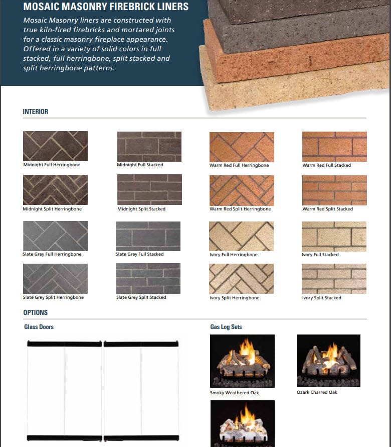 • Mosaic Masonry Firebrick available in a variety of patterns and colors with integrated ash lip (1- required)